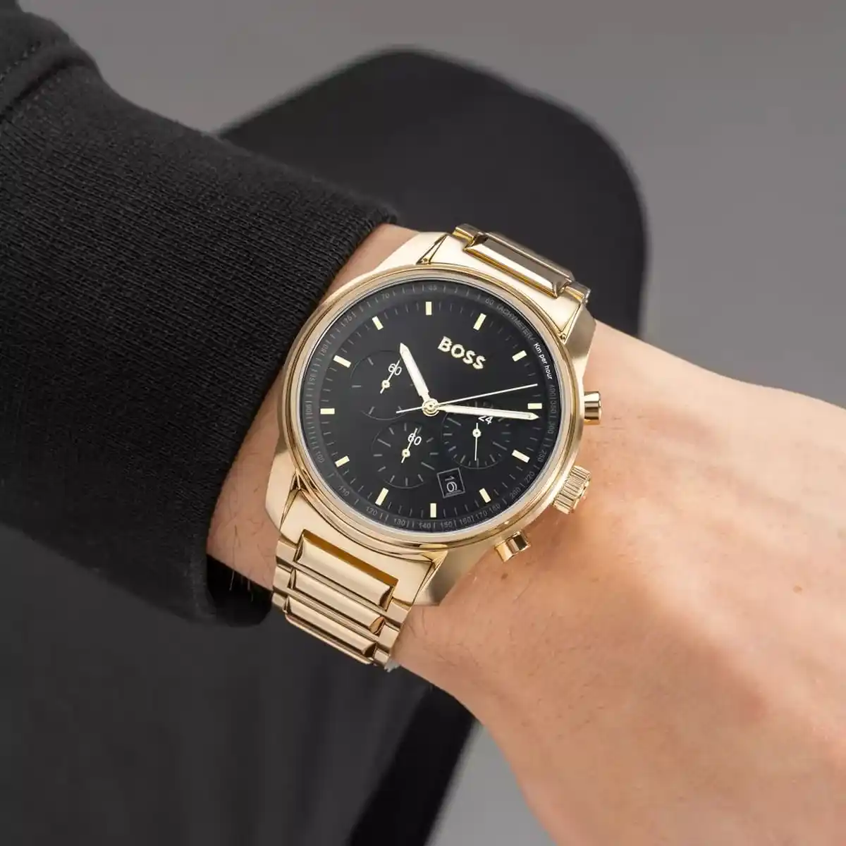 Original Hugo Boss Watch Trace For men In Egypt 1514006 Black dial Gold Metal Strap . With Original packaging Hugo Boss Box + Bag