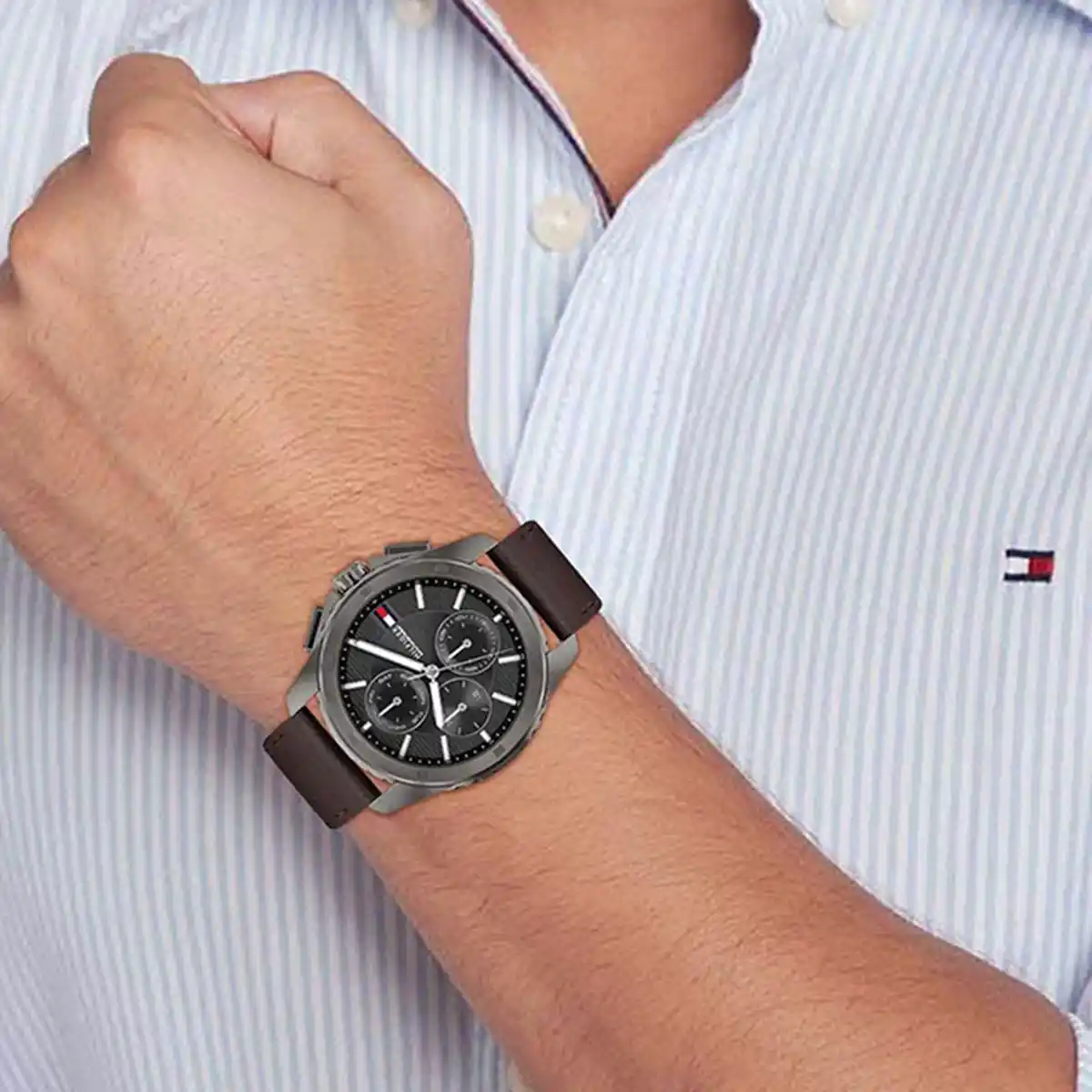 Original Tommy Hilfiger watch for men Trent 1710623 with Grey dial Brown Leather Strap color 50m Water Resistance